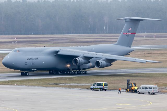 Militärfrachter des Typs Lockheed C-5B Galaxy der US Air Force am Donnerstag (12.02.2015) am Flughafen in Nürnberg. Mit 75,50 m Länge und 67,90 m Flügelspannweite ist es eins der größten... mehr...