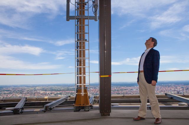 Bayerischer Staatsminister der Finanzen Markus Söder (CSU) auf dem Funkturm am Freitag (04.07.2014) in Nürnberg. Bei einer Pressekonferenz stellte der Minister neue Pläne zur Nutzung des Funkturms ... mehr...