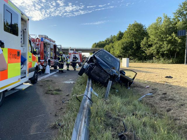 Mehrere umgerissene Verkehrsschilder und ein Fahrzeug, welches auf der Leitplanke hängt: Dieses Bild bot sich am Donnerstagabend (30.07.2020) den Rettungskräften als sie an der Anschlussstelle... mehr...