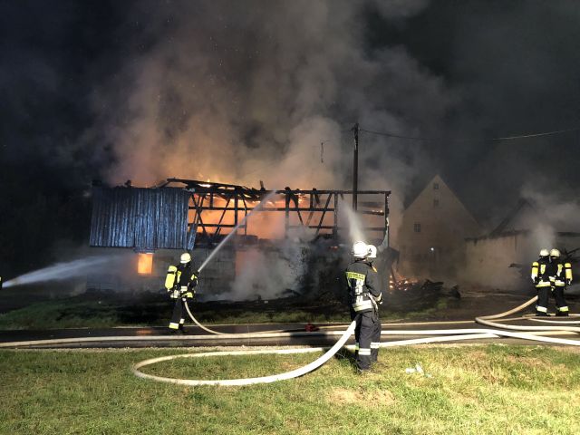 Großalarm in der Nacht auf Donnerstag (13.09.2018) für die Feuerwehren im Nürnberger Land. In Heinleinshof bei Burgthann steht ein landwirtschaftliches Gebäude in Vollbrand. Der Feuerschein ist... mehr...